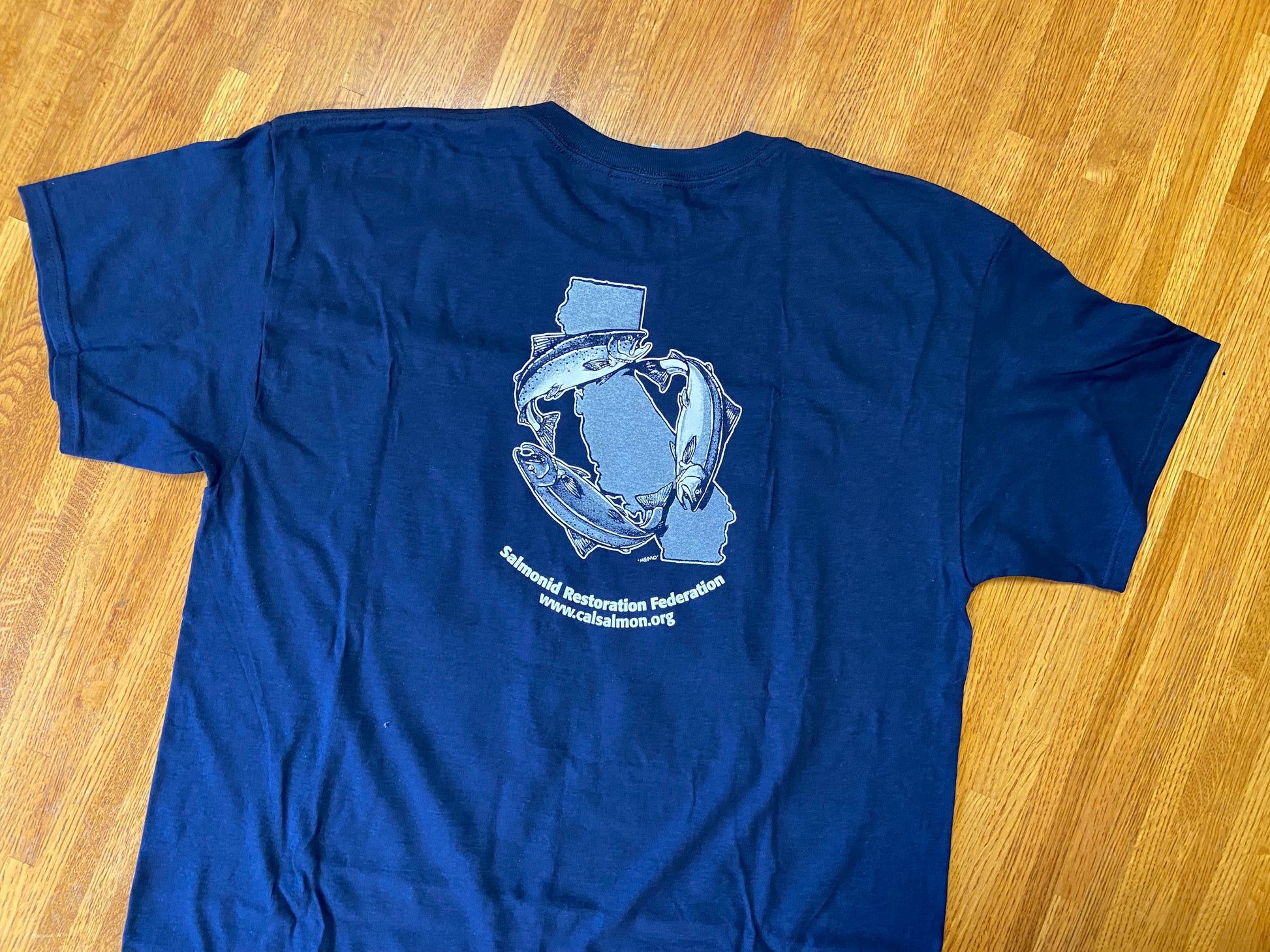 100% cotton, navy blue, T-shirt. Front print of Ray Troll's Artwork. SRF logo printed on the back.