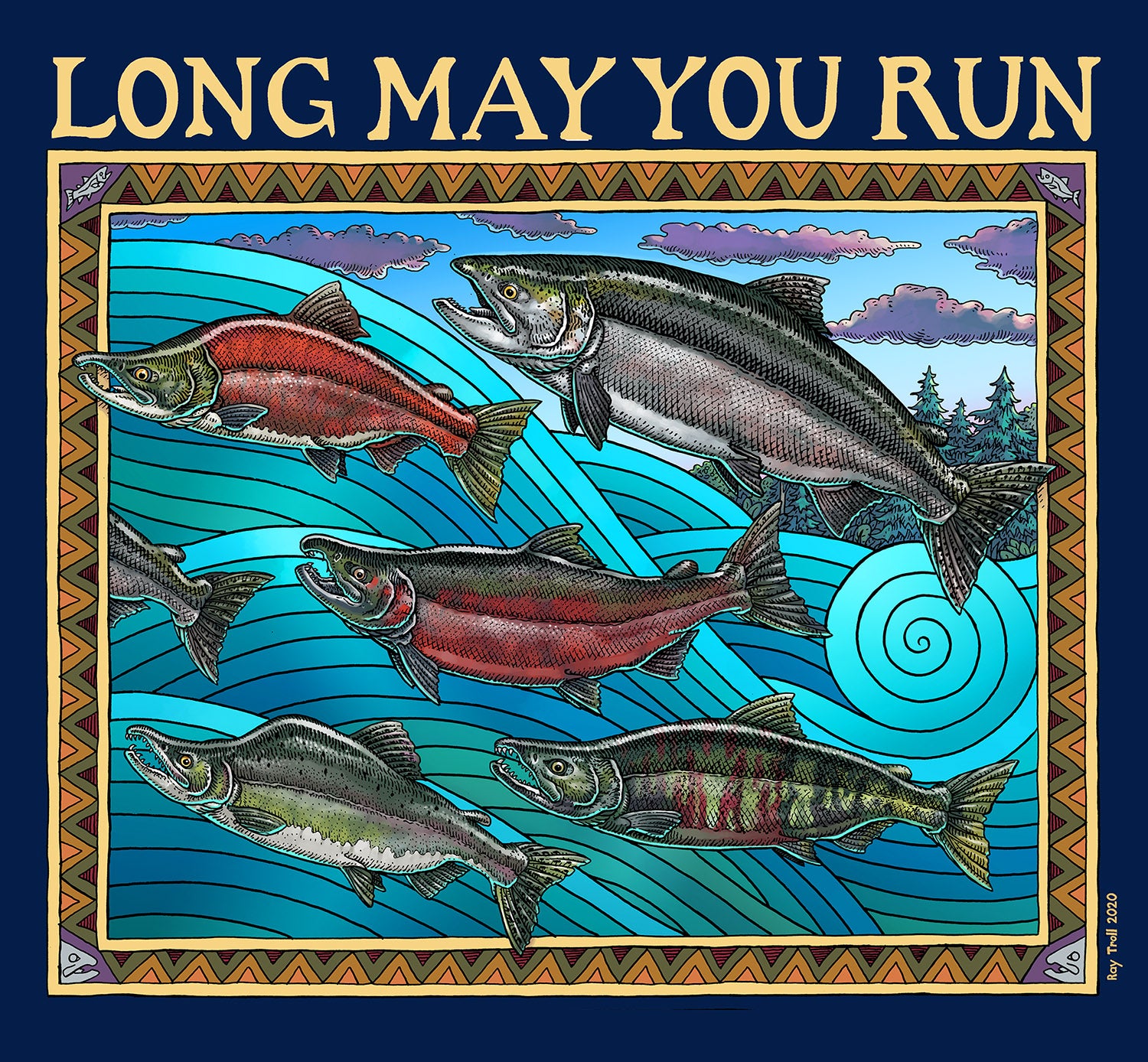 This is a variation on Ray Troll's Midnight Run artwork from what back in 1986 with verbiage inspired by Neil Young’s song of the same name. The simple message behind this shirt is that we should do what we can to protect and preserve wild salmon runs.